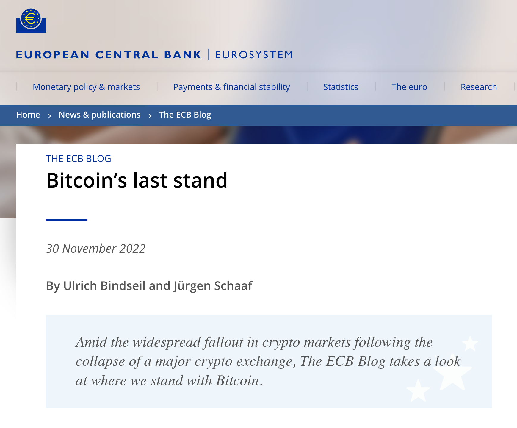 The ECB is a good example. In November 2022, with Bitcoin sitting around $16,000, two ECB economists published a blog post titled “Bitcoin’s Last Stand.” They called it irrelevant, unsuitable as investment or payment, and an unprecedented polluter. It felt most true at precisely the moment it was least true. Within two years Bitcoin was trading above $100,000.