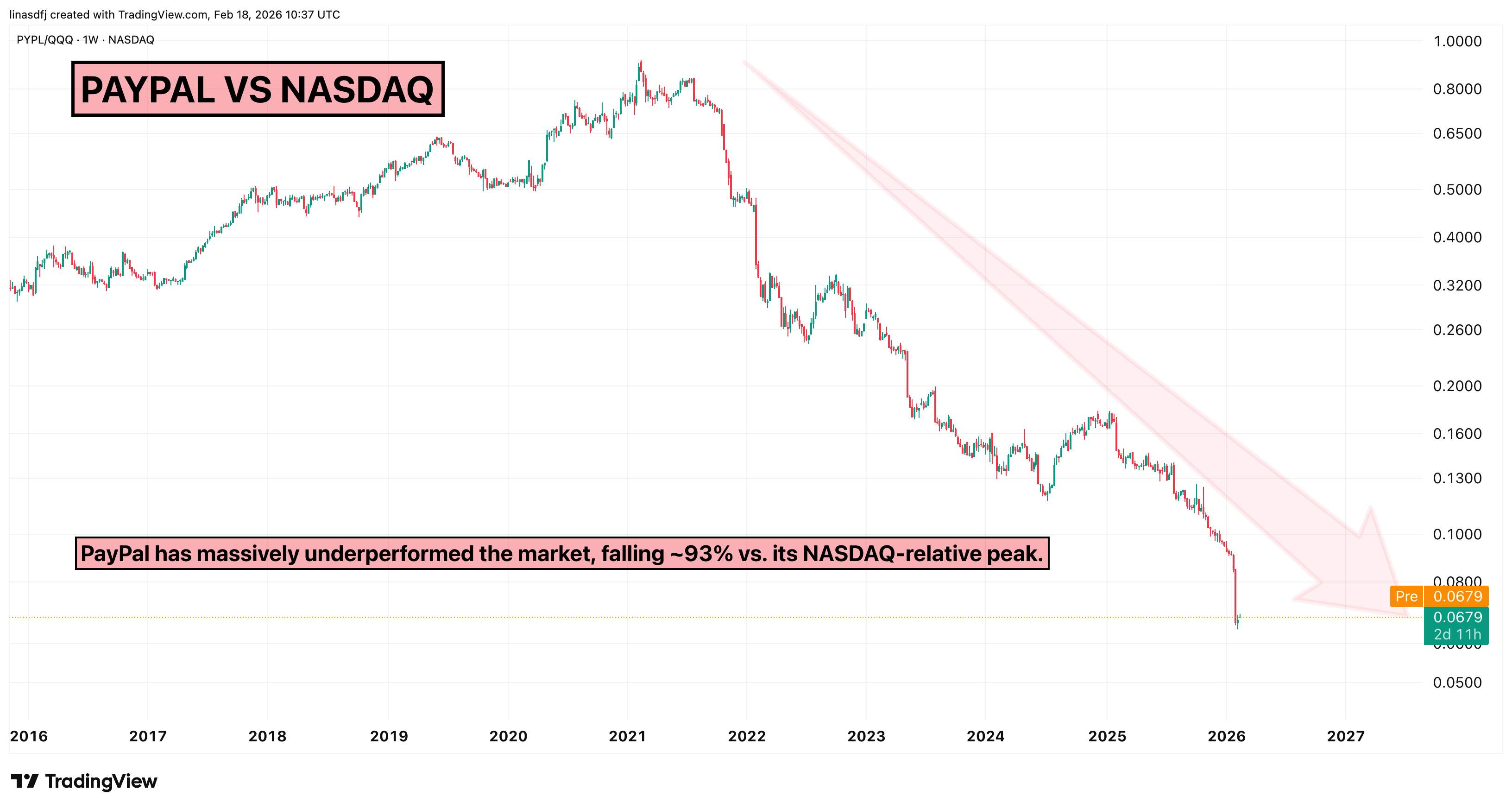 To show how weak this performance has been, let’s compare PayPal to the Nasdaq.