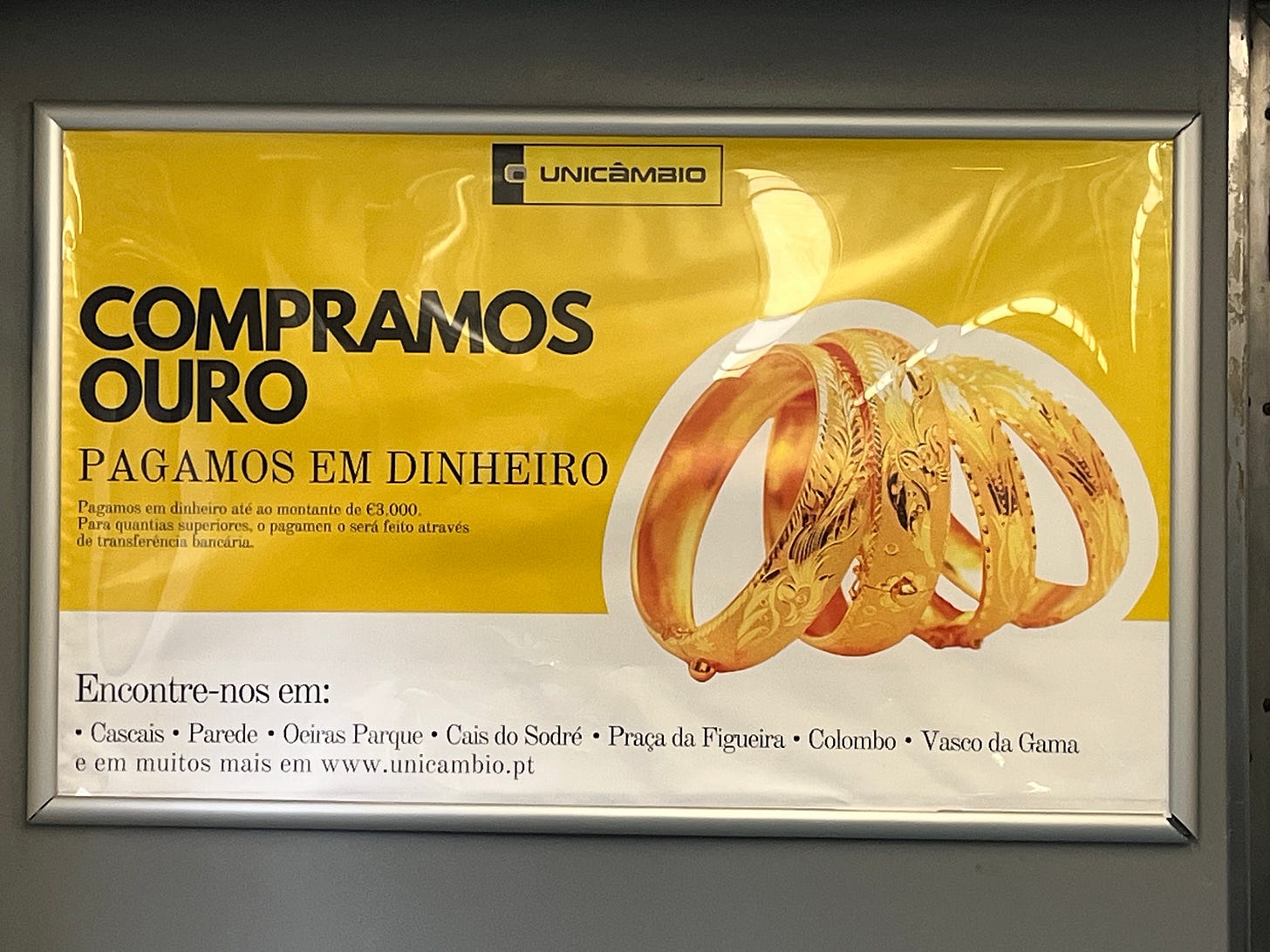 Anecdotally, I’m seeing changes on the ground too. Here in Portugal, signs offering to buy and sell gold have started appearing in public places. A late-cycle signal that appeared in previous gold bull markets.