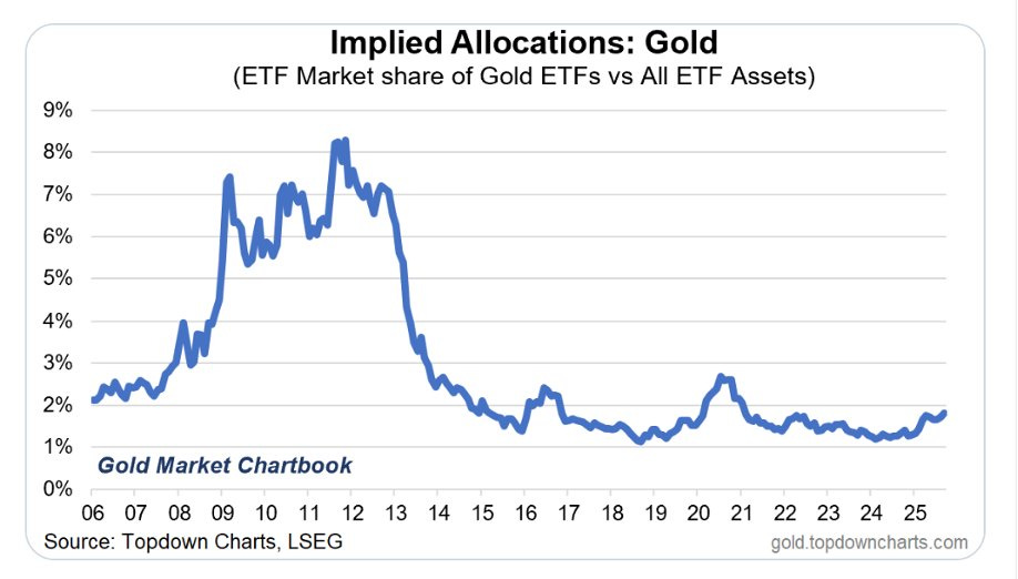 Metals remain marginal in most portfolios. The ETF data makes this clear: gold’s share of total ETF assets is still near cycle lows and far below prior peaks.