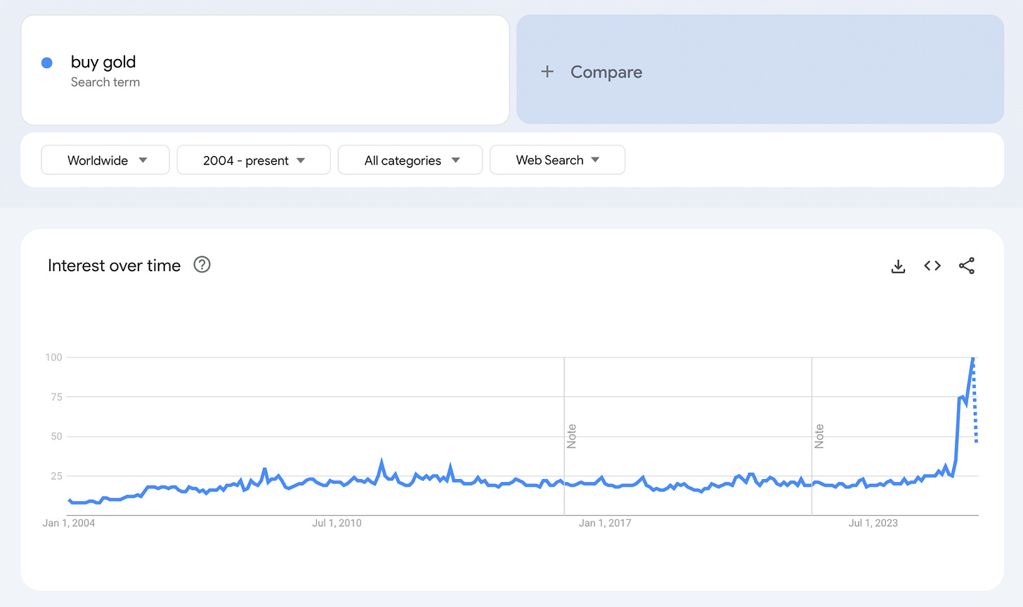 Well, as of the middle of 2025, those conditions are changing. Google Trends shows a rise in searches for “Buy Gold,” suggesting broader awareness is building.