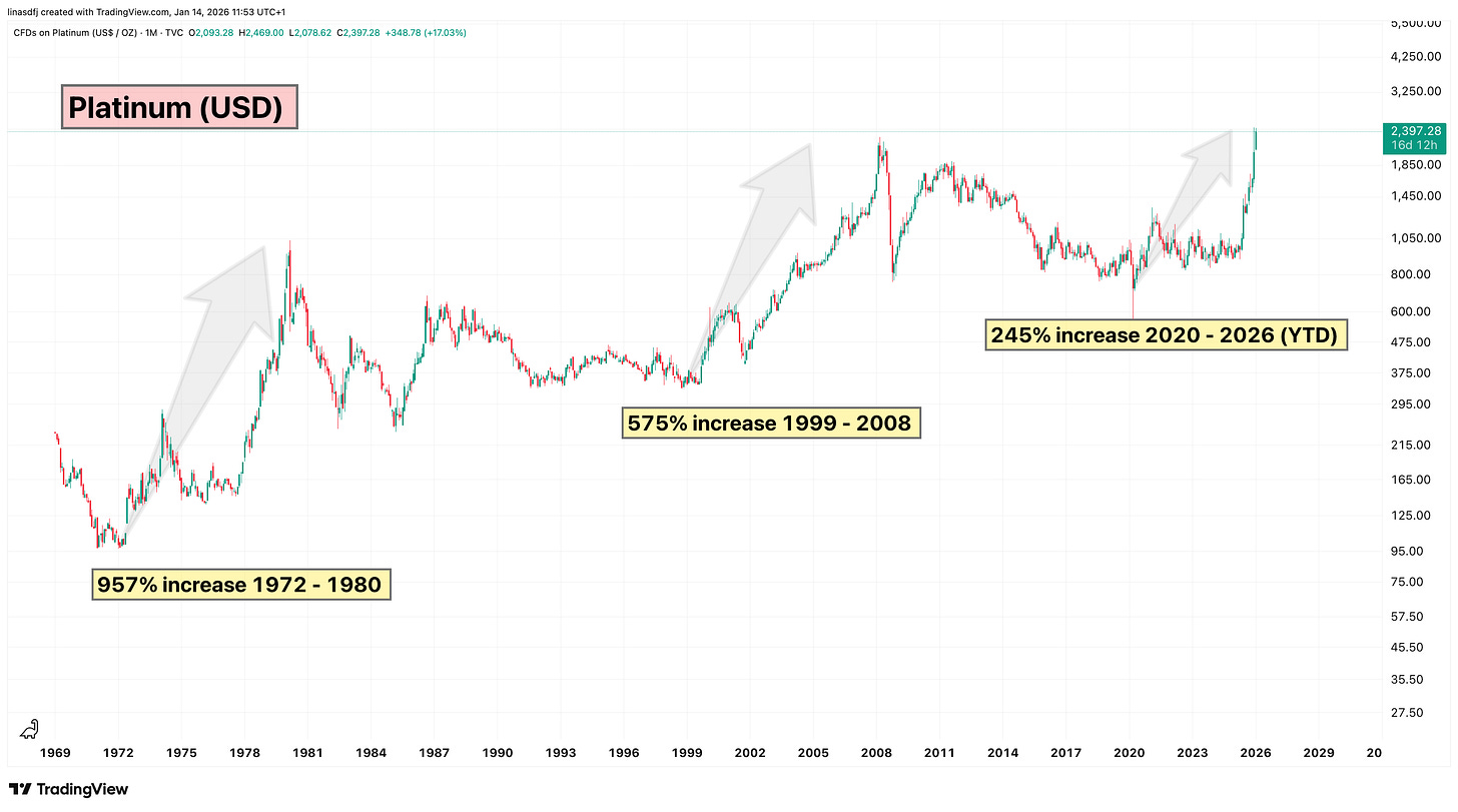 Gold has surged through 2025. Silver is up 6x since the COVID panic. Platinum and palladium are breaking out. Rhodium has doubled. Copper and aluminium are up too.